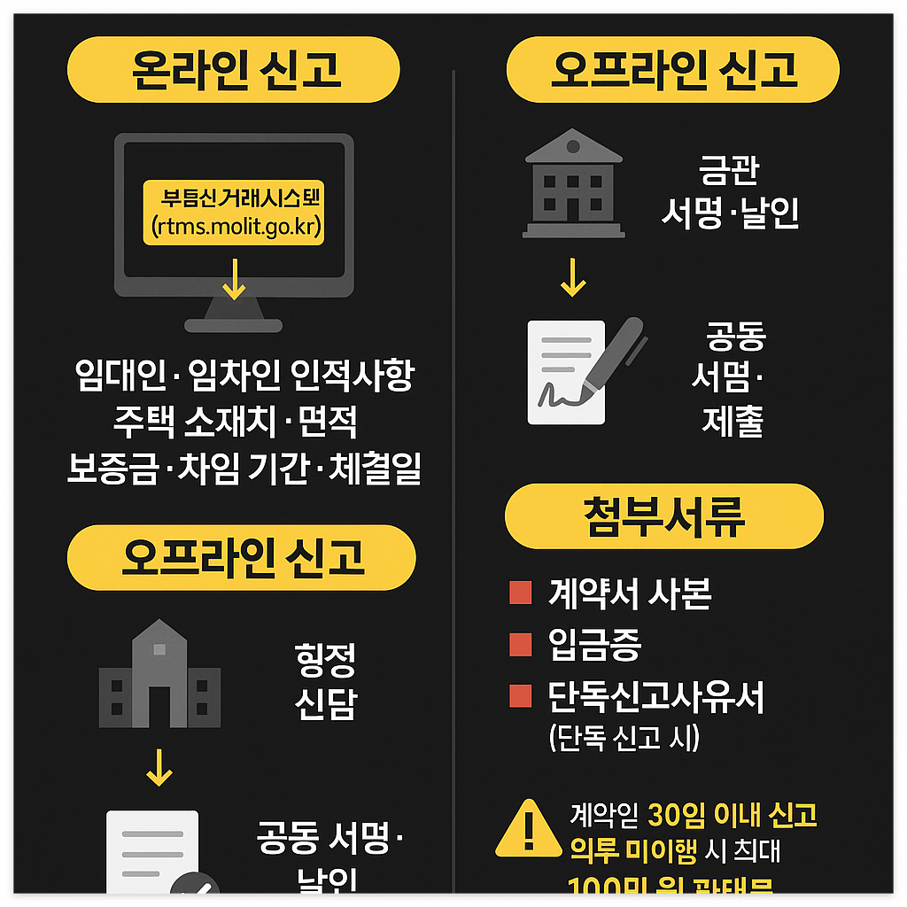 - 온라인 신고: 부동산거래관리시스템(rtms.molit.go.kr) 로그인