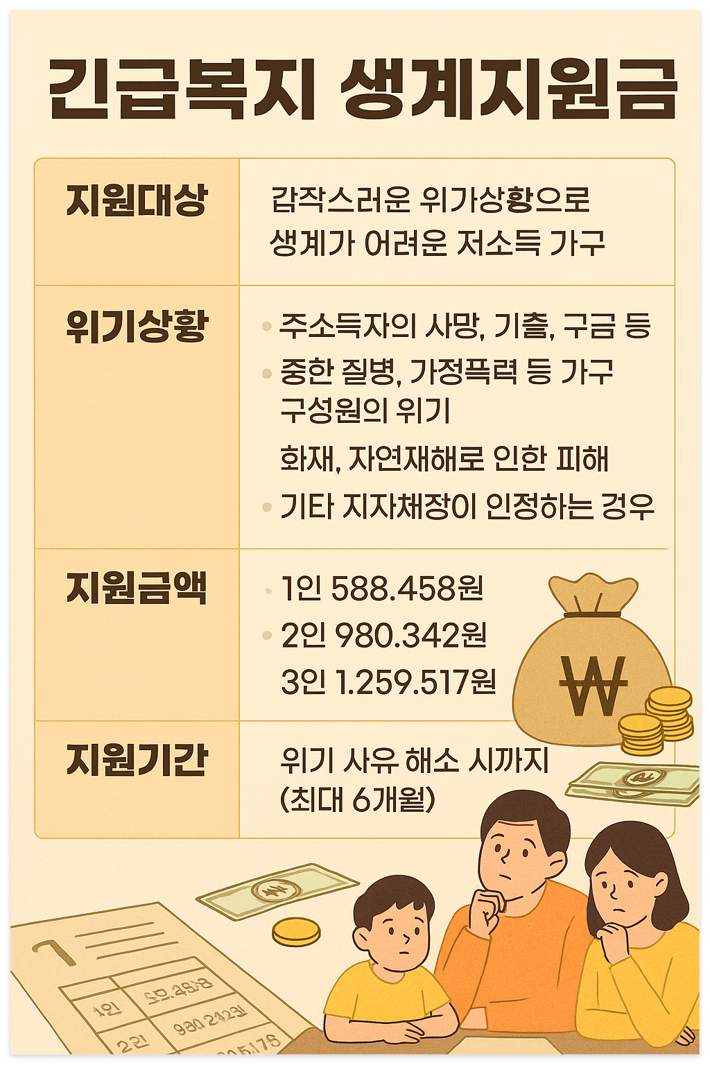 2025년 기준 긴급복지 생계지원금 제도는 실직, 질병, 가정폭력 등 다양한 위기 상황에 처한 저소득 가구에게 지급됩니다. 신청 조건부터 금액, 절차까지 꼭 알아두세요.